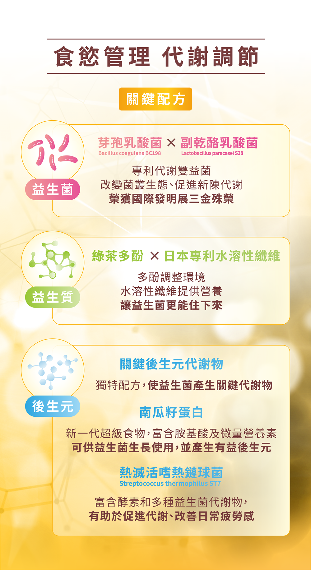 🔶專利代謝雙益菌,搭配比菲德氏龍根菌,改變菌叢生態,促進新陳代謝